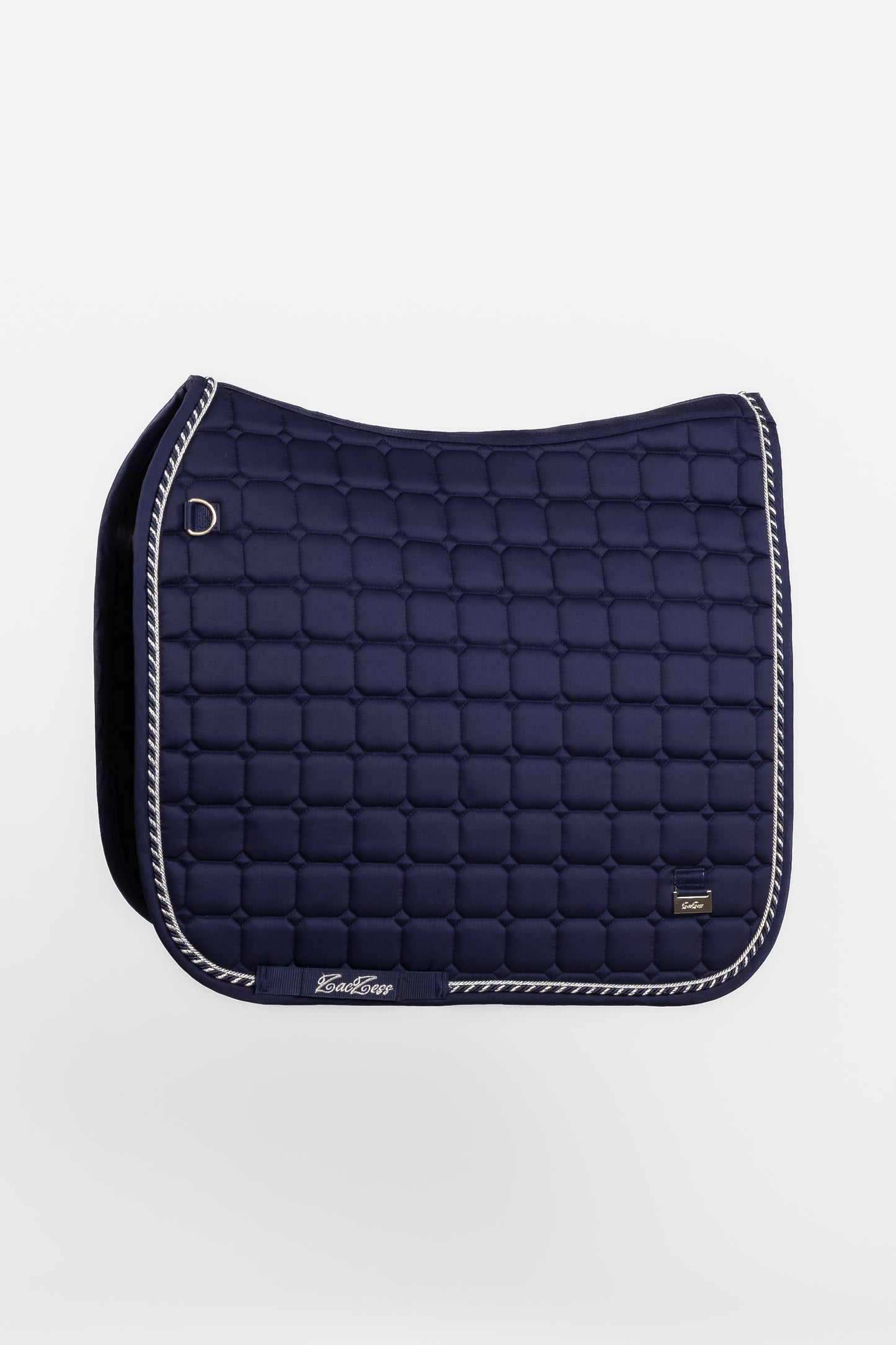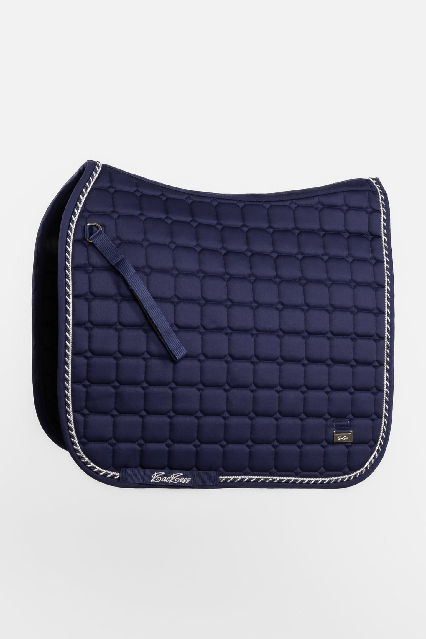 A blue saddle pad in dressage style with silver details and a sleek logo in silver color on both sides. The inside is lined with Quick Dry material that effectively wicks away sweat and keeps the horse dry.