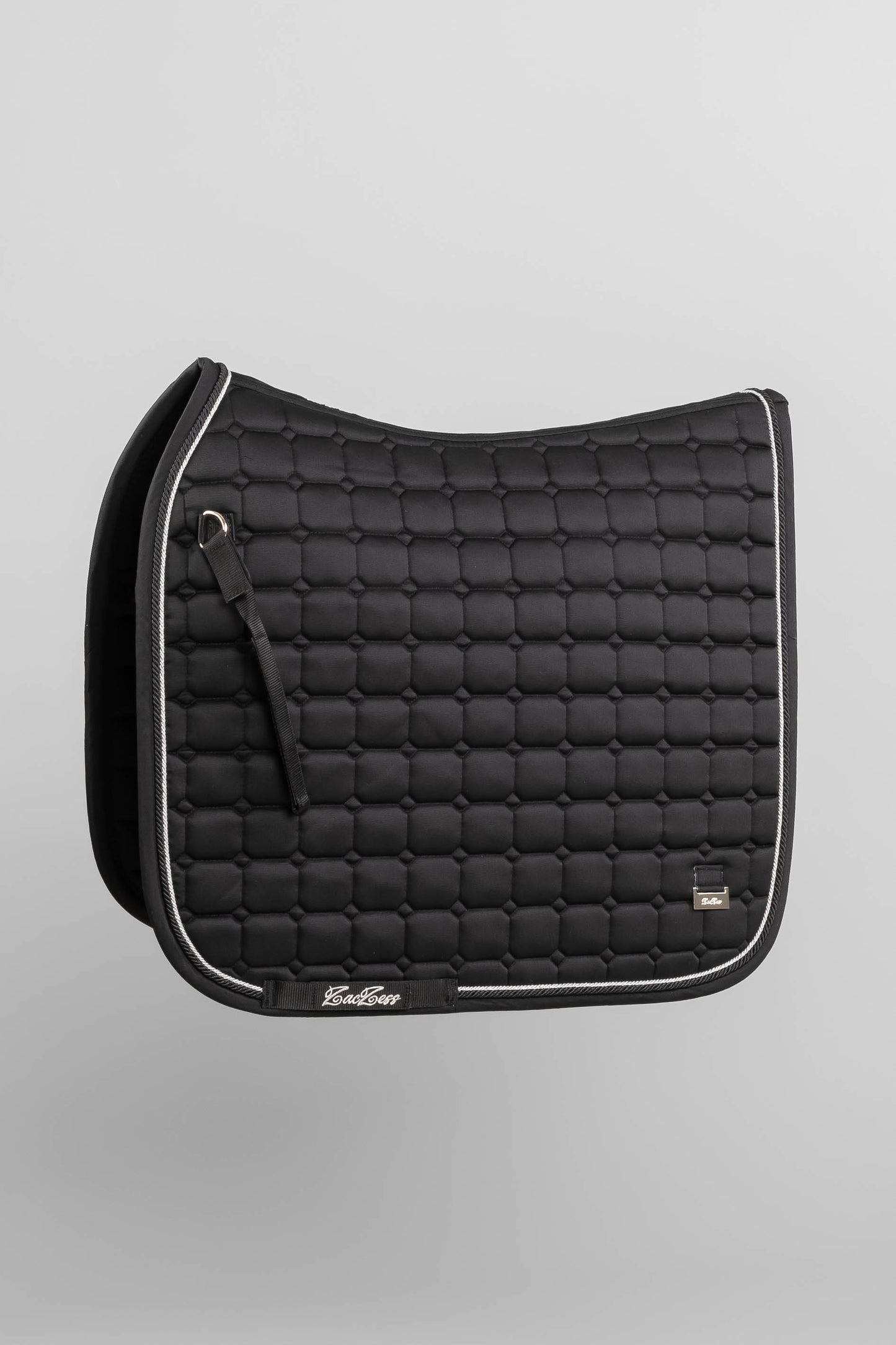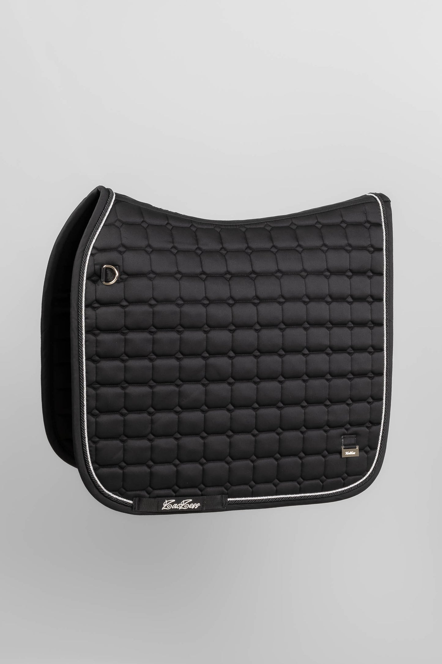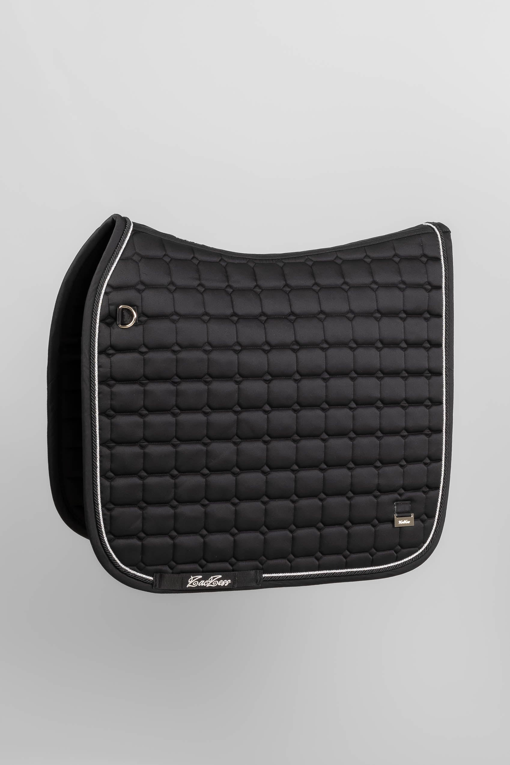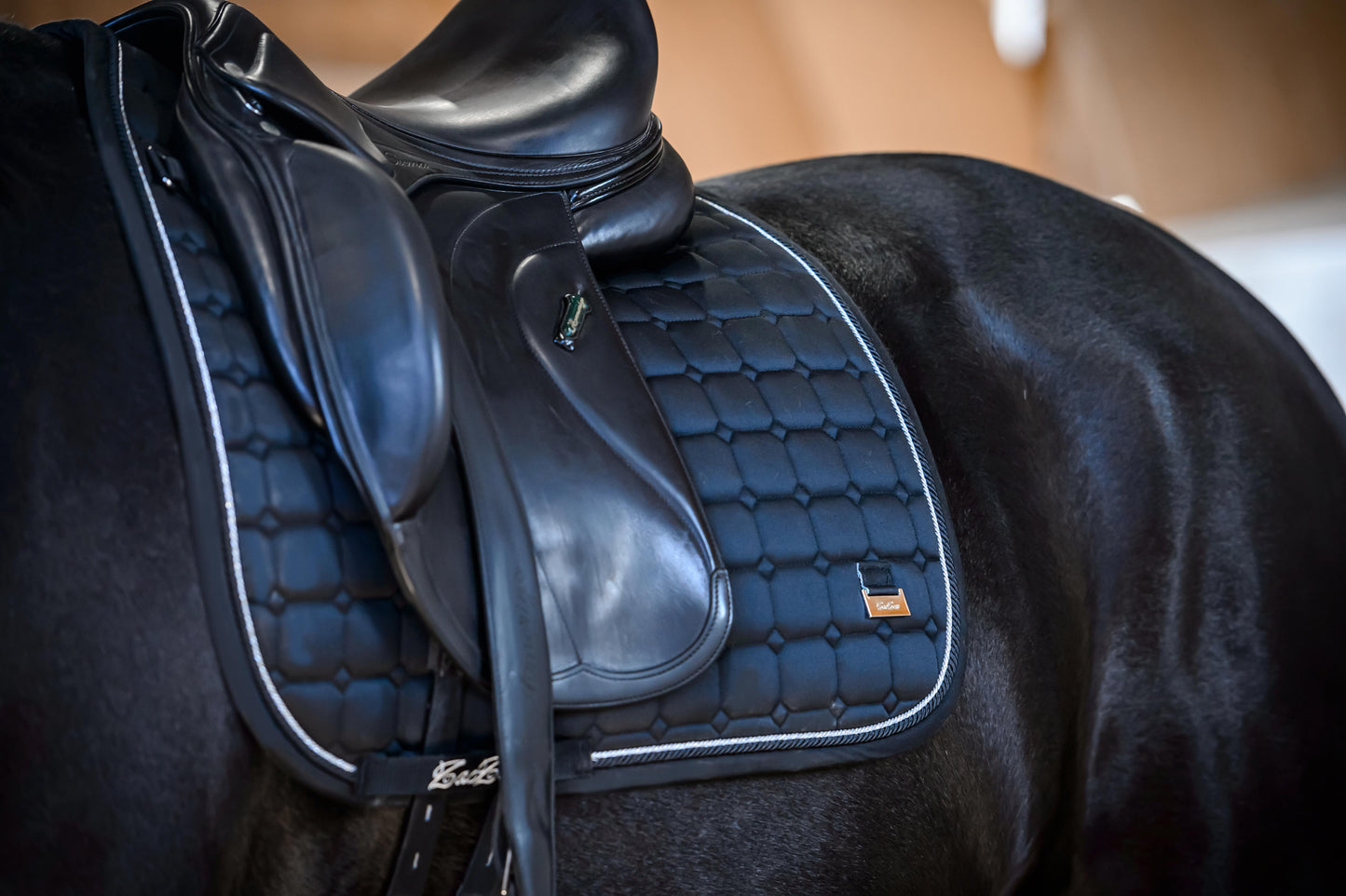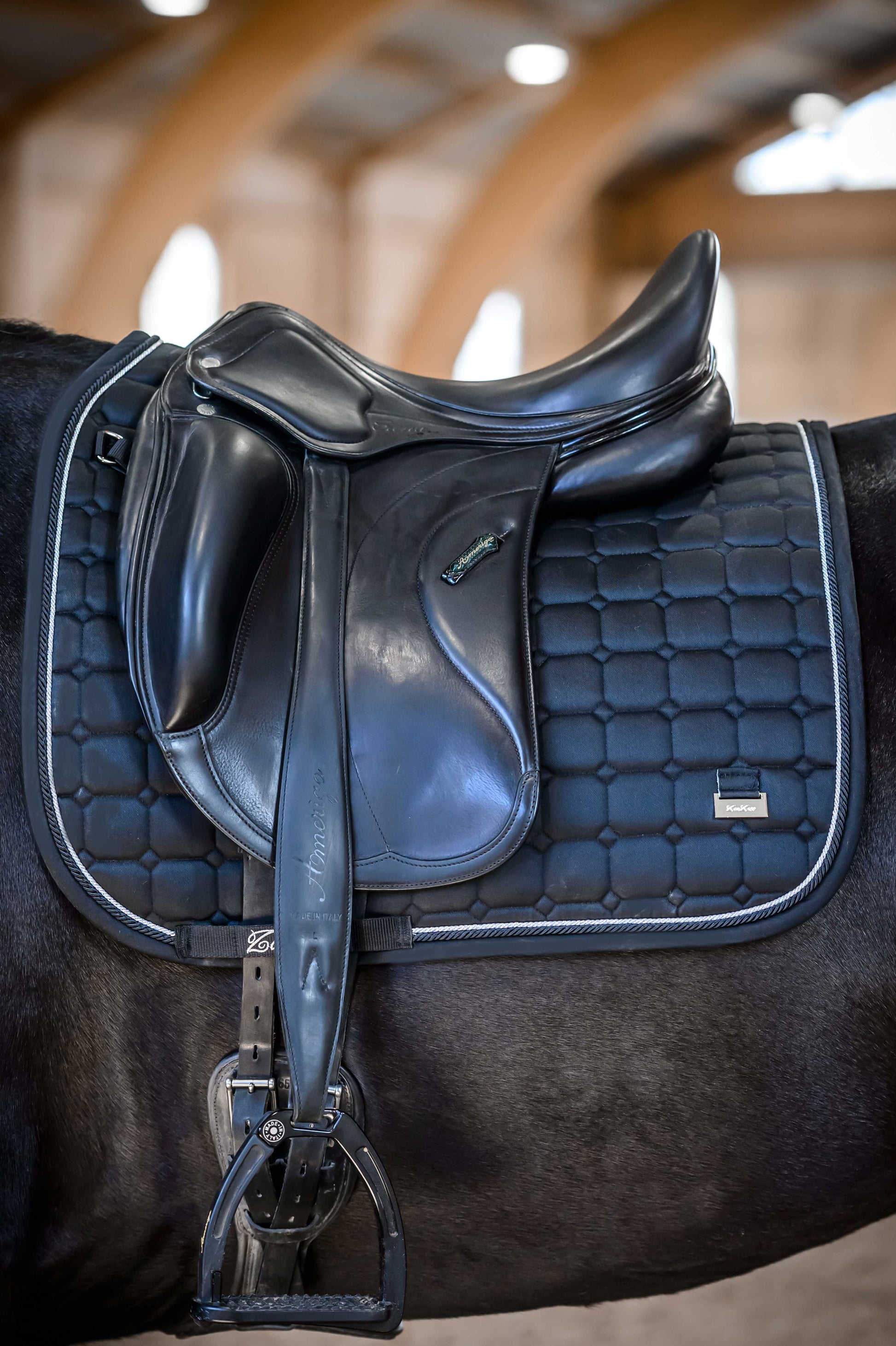 Musta satulahuopa dressyristyyli hopeisilla yksityiskohdilla ja tyylikkäällä hopeanvärisellä logolla molemmilla puolilla. Sisäpuoli on vuorattu Quick Dry -materiaalilla, joka tehokkaasti siirtää hikeä pois ja pitää hevosen kuivana.