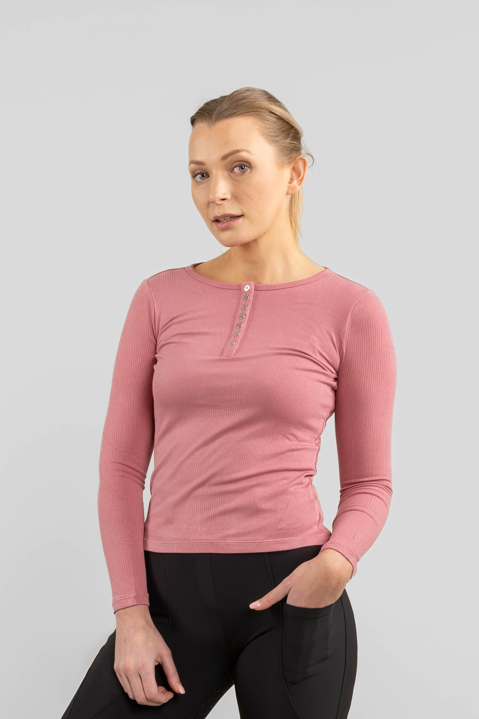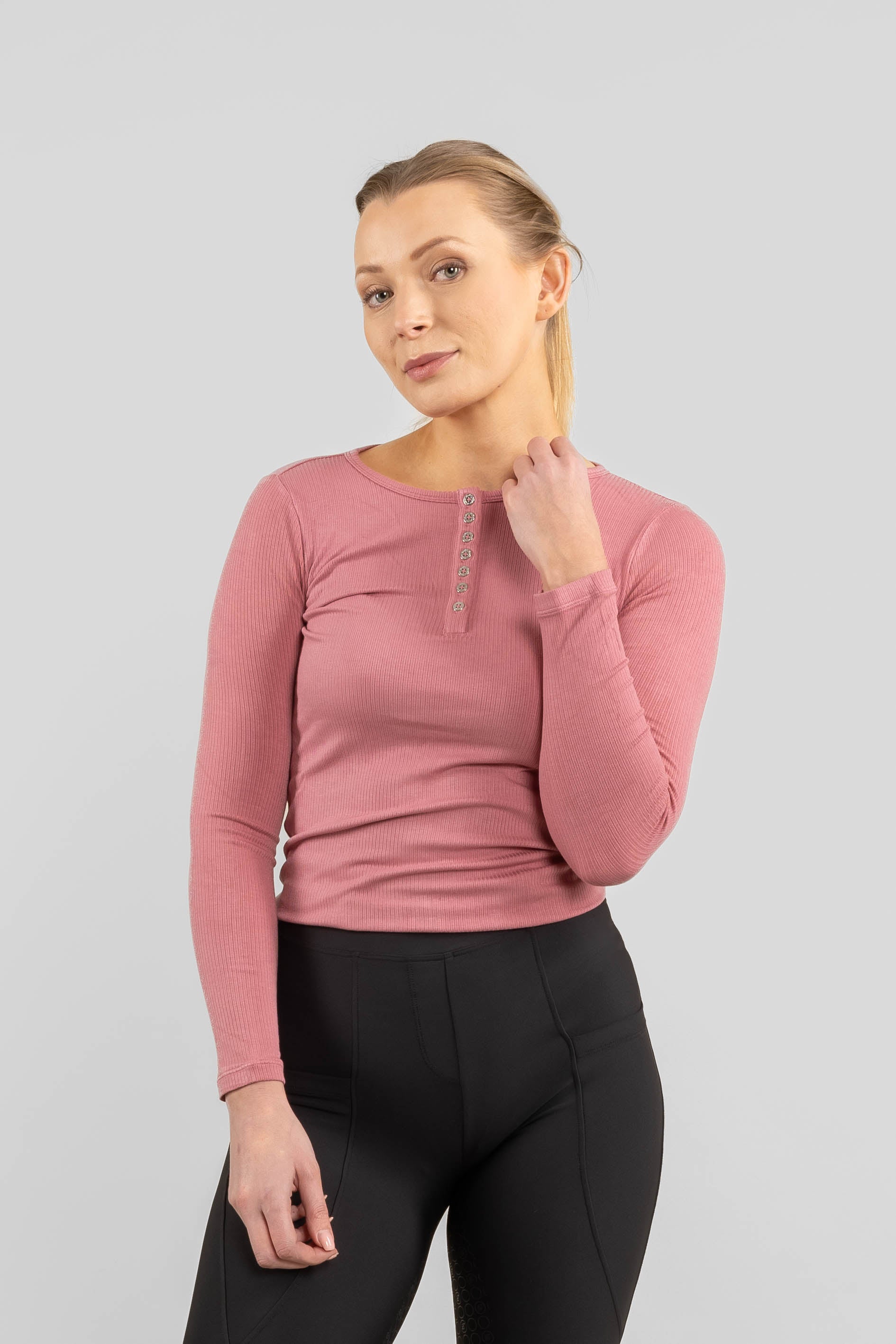 Tyylikkäiden yksityiskohtien ansiosta tunnet itsesi pukeutuneeksi, vaikka päälläsi onkin mukavin neuleesi. Materiaali siirtää pois hikeä ja lämpöä, mikä pitää sinut kuivana koko ratsastustunnin ajan.