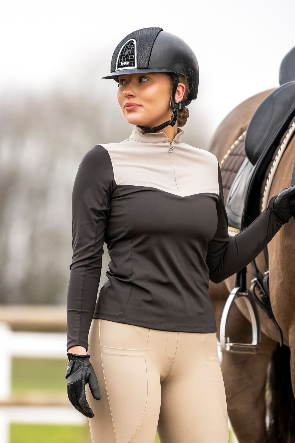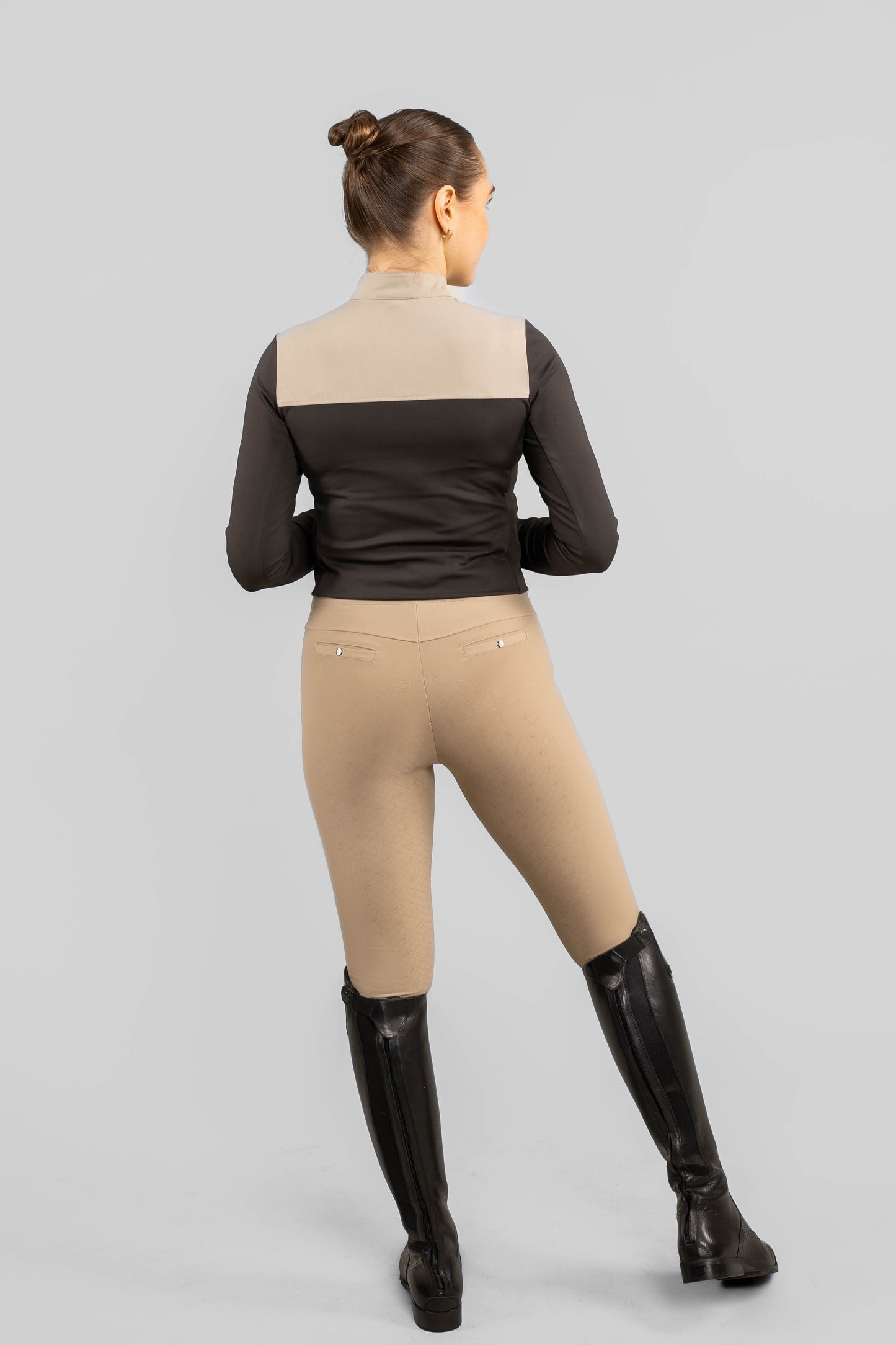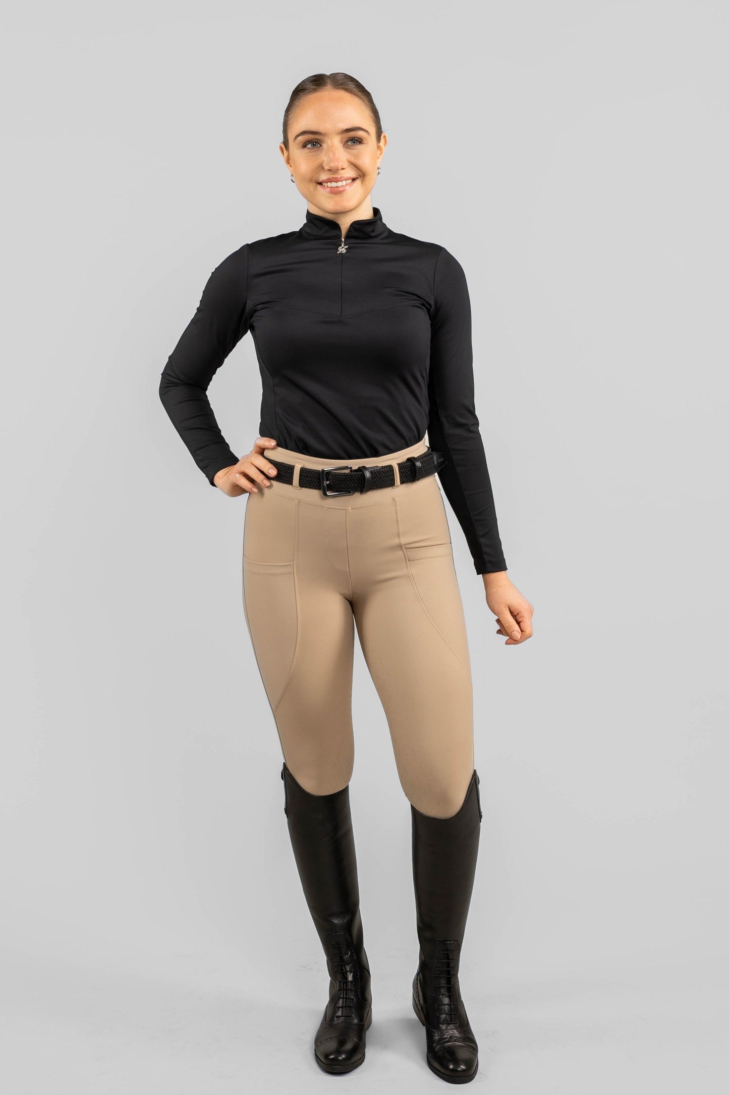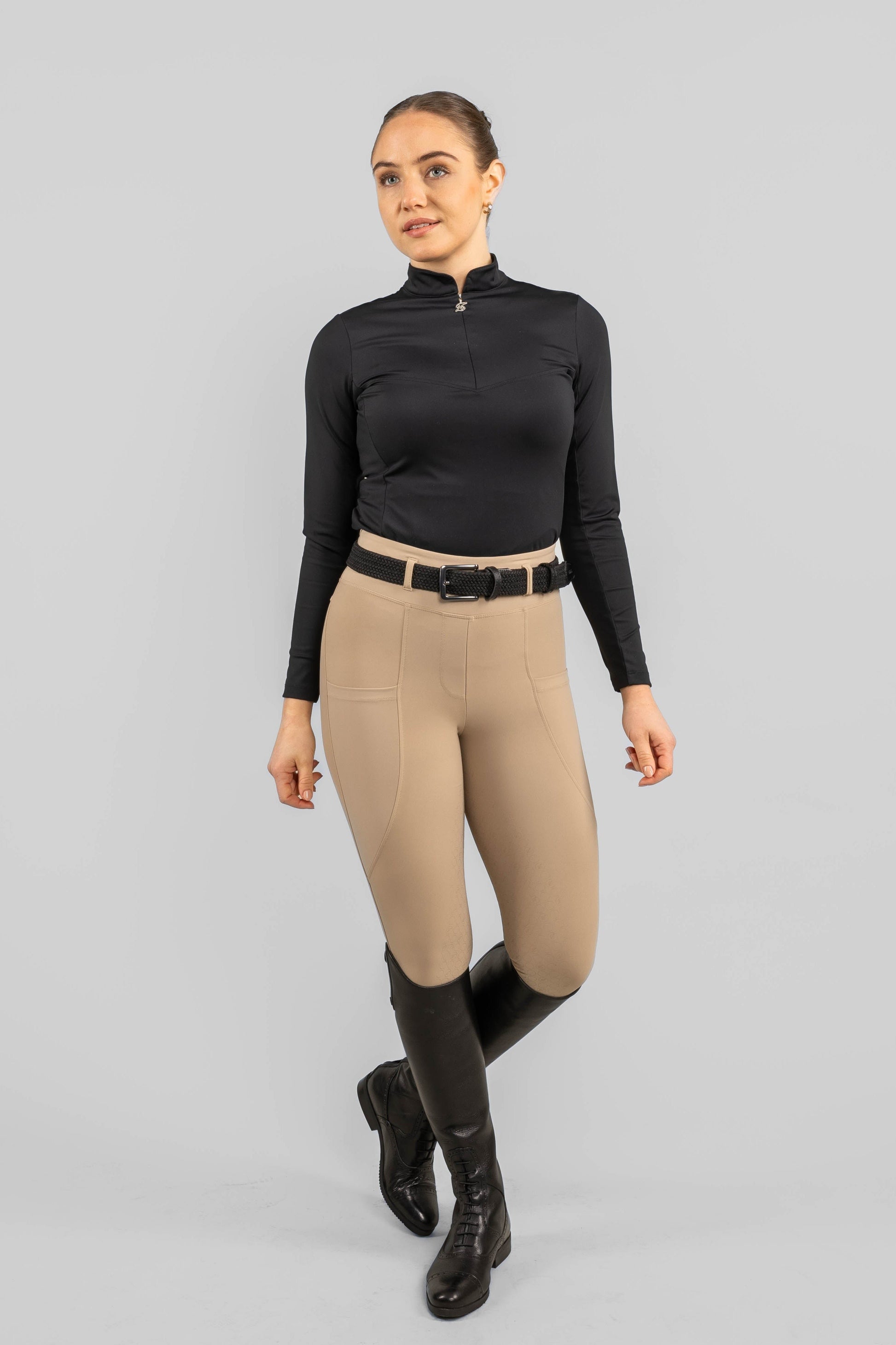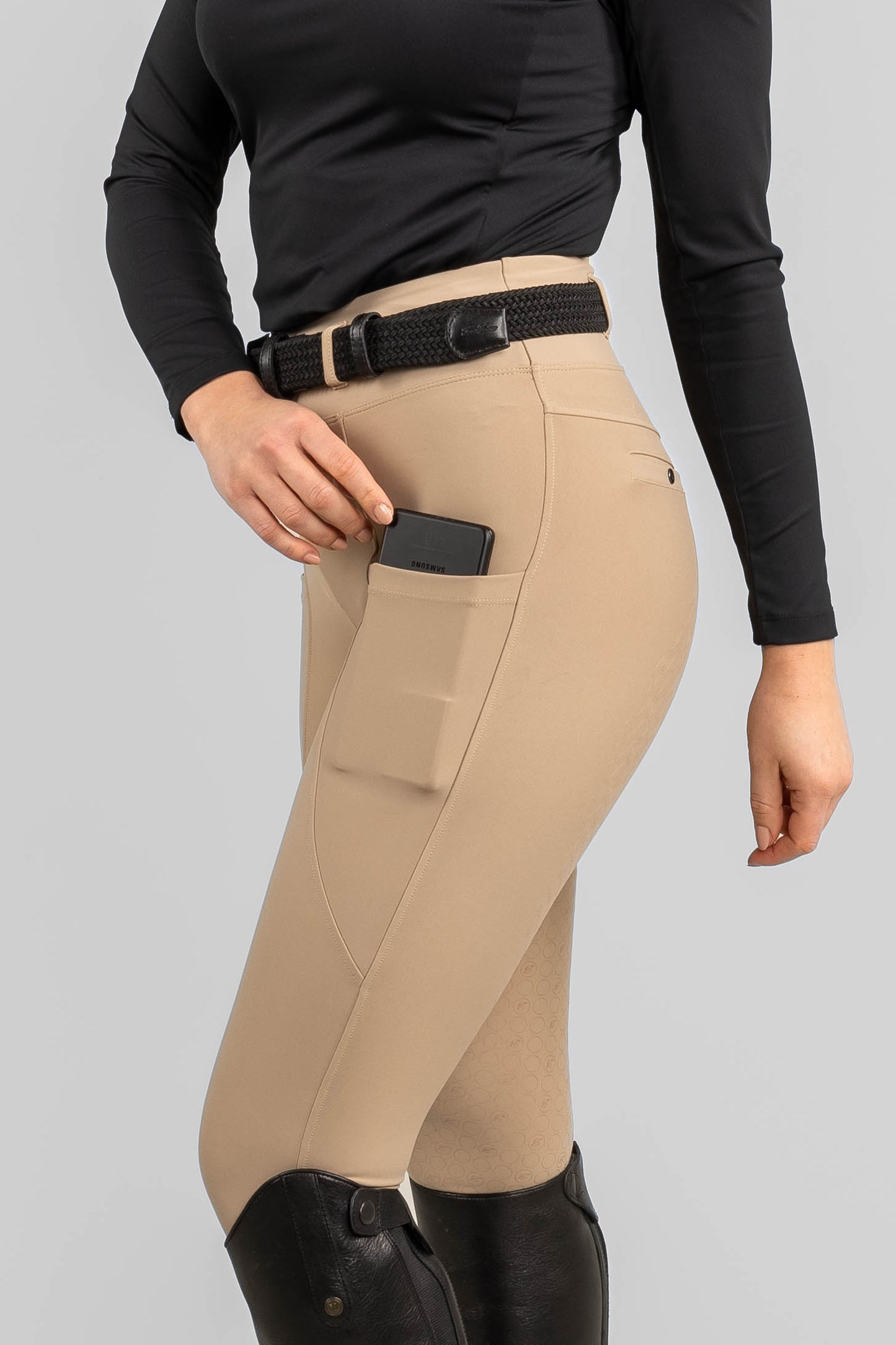 Hög midja, stilrena detaljer, skärphällor och två rymliga mobilfickor – allt du behöver för både stil och funktion i sadeln och stallet.